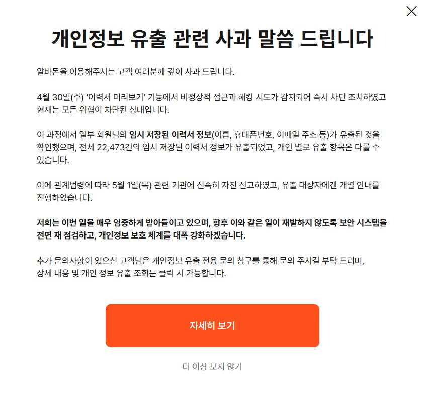 2025년 5월 2일, <서울경제> 보도에 따르면 알바몬에서 약 2만 2,000건의 개인정보가 유출되었습니다.