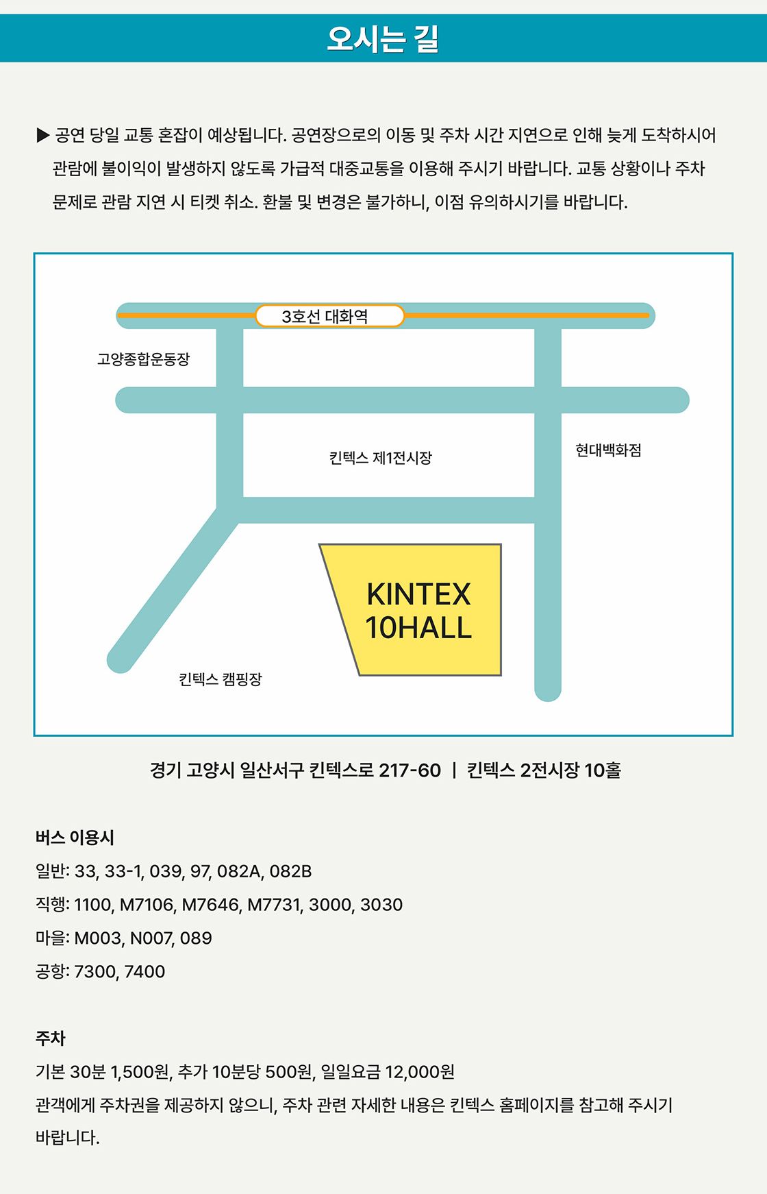 - 공연장 위치: 일산 킨텍스 제2전시장 10홀은 대중교통으로도 접근이 용이하나, 공연 당일 교통 혼잡이 예상되므로 여유 있게 출발하시기 바랍니다.