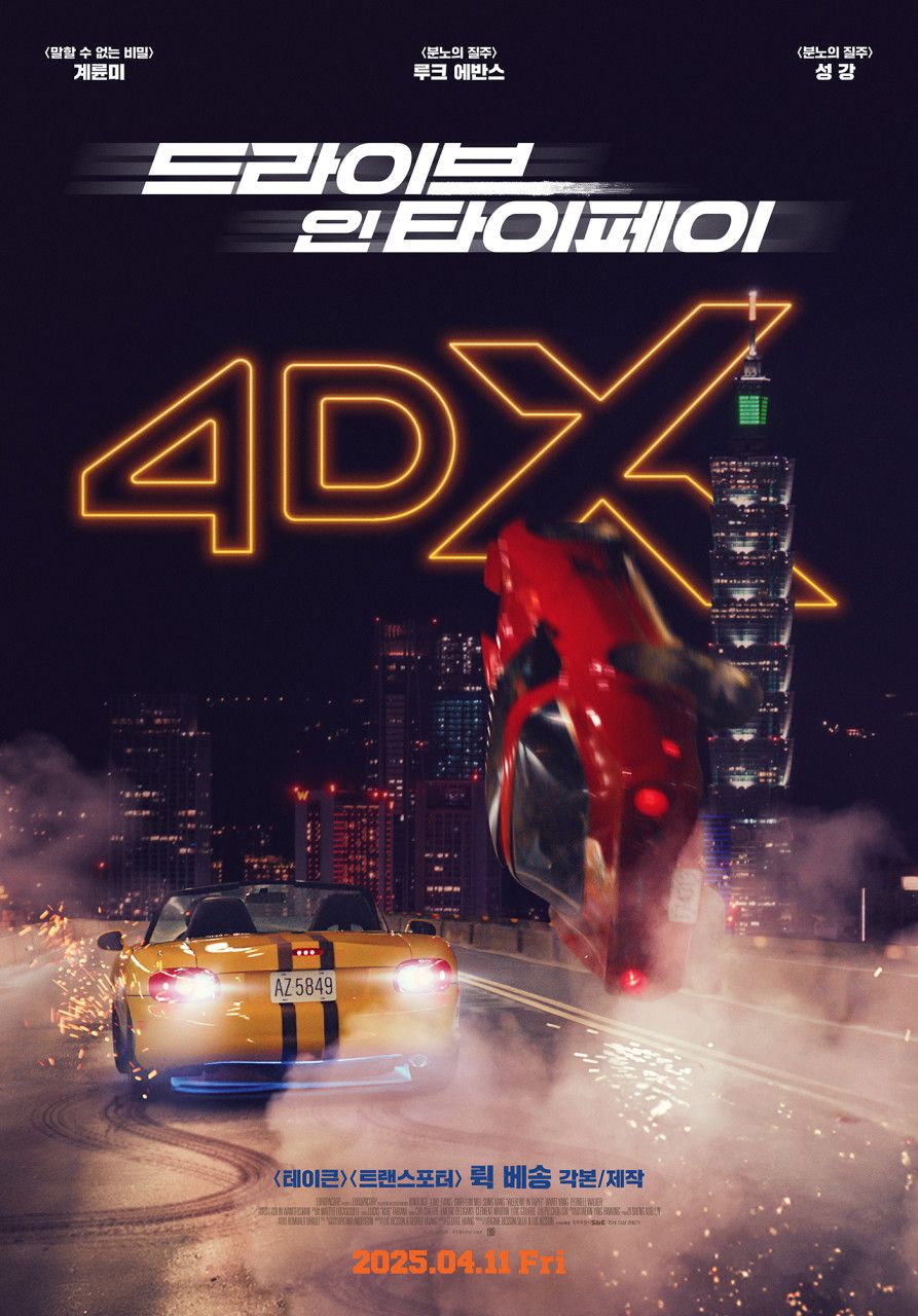 4DX 상영 정보: '드라이브 인 타이페이'는 4DX 상영을 통해 관객들에게 더욱 실감나는 카체이싱 액션을 제공합니다. 타이페이 도심을 가로지르는 극한의 추격전을 4DX 효과와 함께 체험할 수 있습니다.